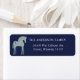 Watercolor Dala Christmas Horse on navy blue background. Return address idea for Christmas cards and correspondence. The Swedish Dala Horse is a Christmas decoration which represents the folk art of an area in villages in Dalarna county in Sweden.