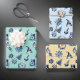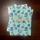 This cute elfin pattern features cute elves, winter wreathes, snowy snowflake, Santa hats, Christmas trees, and more, with your monogram initial appearing in contrasting red within the wreath as it repeats on each page. The sheets have different colour backgrounds - pale greenish aqua, light silvery grey blue, and soft yellow, with the pattern in navy, blue, and silvery grey.