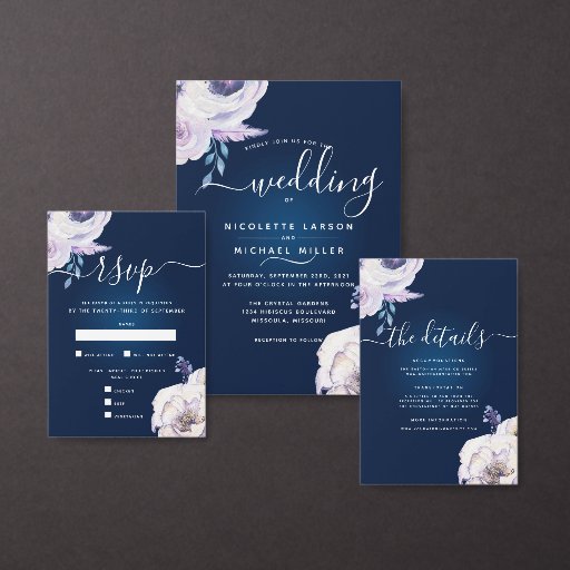 This gorgeous floral wedding suite features soft pink and lilac roses against a dramatic navy blue background. Romantic calligraphy script is complimented by a clean modern font that highlights your wedding details. Perfect for a spring or summer wedding. Easily edit the template with your details.