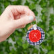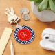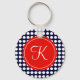 Navy blue and white polka dots with a pop of blod red for a classic, nautical look. Personalise with any initial.