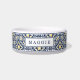 Inspired by the traditional azulejo tiles of Spain and Portugal, this Mediterranean style patterned dog bowl features a coastal colour palette of navy blue, sunny golden yellow and white with your pet's name on the front.