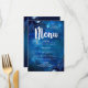 Be proud, rejoice and showcase this milestone of your favourite Bar Mitzvah with a celebration to be proud of! Tempt your guests with this stunning, modern, party meal menu, featuring white calligraphy script, bold white typography, and steel blue agate rocks accented with faux silver veins, all overlaying a deep blue galaxy watercolor background. His name, date of event, white Star of David, and more agate rocks over a navy blue background, are on the back. Personalise the custom text with all your menu and other information. Guaranteed to add stylish fun to his special occasion!