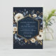 A dramatic navy backdrop is adorned with a lavish display of creamy white and soft blue blossoms. Golden accents add a touch of sparkle amidst lush foliage and delicate floral sprays. This design evokes a feeling of refined opulence for a memorable occasion.