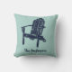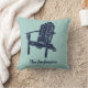 Add a name or your own custom text to create a personalised throw pillow or cushion. This pillow features an illustration of a wooden Adirondack chair in navy blue set against a light aqua blue background with your message in navy blue script lettering below the graphic. The reverse side has a coordinated striped pattern.