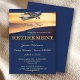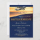 Retirement party invitation featuring an image of an aeroplane taking off to freedom. The background is navy blue with a slight texture (printed) and a gold stylised bottom ornament.