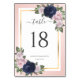 Elegant navy blue and blush floral wedding table numbers. Matching items available.
