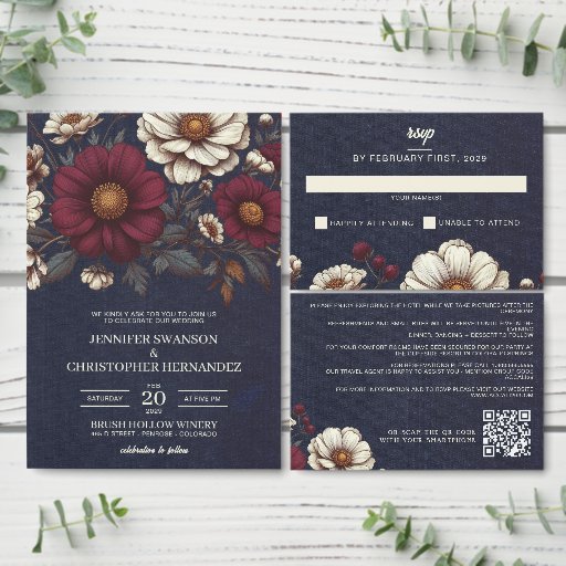 Navy Blue and Burgundy Floral Wedding RSVP Card