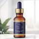 This dropper bottle product label features a navy blue background and a faux gold foil border. This label measures 2.375 inches long by 1.25 inches high (60 mm long by 38 mm in height) and is a great choice when you are looking to package essential oils, fragrance oils, face serums, hair serums, and other products in standard 0.5 ounce or 1 ounce glass dropper bottles.