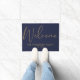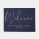 An elegant navy blue and gold doormat featuring beautiful script calligraphy welcome and personalized with your family name and special date. Designed by Thisisnotme©
