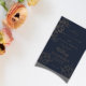 A luxurious navy blue wedding invitation featuring delicate gold floral designs and butterfly accents. Perfect for romantic afternoon weddings, formal ceremonies, and elegant celebrations. Customise with your wedding details for a timeless, sophisticated invitation.