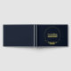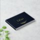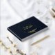 A beautiful gold foil wedding guestbook in a deep rich navy blue with a delicate floral circle in gold