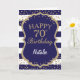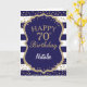 Navy Blue and Gold Glitter confetti 70th Birthday Card with personalized name. For further customization, please click the "Customize it" button and use our design tool to modify this template.