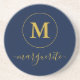 This personalised coaster is simple, sophisticated and elegant. It features a navy blue background with a gold monogram and script typography for your personalisation. Colours can be customised to your choosing