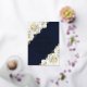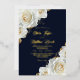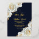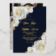 Modern stylish wedding invitation with white roses, gold dust on with a gold ink pour effect (the gold is a digital effect, not real foil) and modern calligraphy. Classy and elegant, simple and modern invitation.