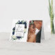 Design features an elegant watercolor floral wreath decorated with peonies, roses, eucalyptus greenery and more in shades of navy blue, green and ivory. Design also features a silver grey printed box beneath the wreath with a modern font - text layout. A matching floral arrangement is added to the inside to carry over the overall theme. Change the demo photo to your very own.