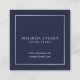 Elegant stylish design featuring monogram, name and details in silver professional font style with silver square border on navy blue background.