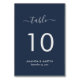 Personalised navy blue and silver wedding table number card featuring a modern script font. Matching items available.