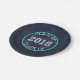 Simple and fun Class of 2018 graduation party design features a navy blue chalkboard background. There is faded chalk writing on the background. There are lines made up of teal circle and polka dots that run across the centre and inside of a teal blue circle. There is text in large chalk like font that says Class Of 2018! This cool graduation party design coordinates perfectly with our Navy Blue and Teal Chalkboard Graduation Party invitations! Matching postage and napkins also available.