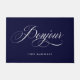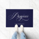 This French modern and elegant doormat says "bonjour" in swirly, white script calligraphy on a navy blue background, and has a spot for your family name.
