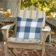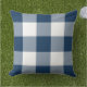 Pillow design features a casual gingham plaid / check pattern that is perfect for summertime! Note, you can customise the navy blue background colour to coordinate with your outdoor decor.
