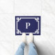 Decorative white Greek Key style geometric rectangular border on a dark navy blue 18" x 24" door mat with a modern serif monogram.