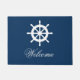 Elegant Navy blue and white nautical custom door mat. Make your own custom monogrammed indoor / outdoor doormat with custom background colour and text. Add your own welcome message, family name, surname, initial letter or funny quote. Cute gift idea for new home / housewarming, wedding venue, store, shop, company office, business etc. Stylish script typography white boat helm logo. Personalizable template with ship wheel icon. Create your own classy entry mat / rug for front door / entryway or hall. Customisable home decor / decorations for your beach house. Cute maritime gift idea for sailing / boating enthusiast, couple, sailor, boat captain or newly weds.