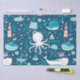 Add a custom nautical touch to your little kid's baby shower or birthday party with this adorable ocean tissue paper. Tissue paper has a pattern of a whale, octopus, sailboat, steam boat, submarine, jellyfish, and lighthouse on a navy blue background. Tissue paper may be personalised with the first name of your kid.