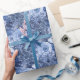 Beautiful pale blue roses on dark navy blue with a lace like floral detail and white flowers.
