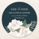 A modern save the date in a unique coaster format designed on a classy navy blue background and with a bouquet of white roses at the bottom. "Save the Date..." appears at the top of your coaster in white block and script lettering, with your wedding date and wedding location in the middle. Use the additional line of text to share your wedding website or additional details. Change the colour of the background and the font per your liking.