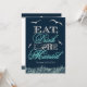 Navy Blue & Aqua Nautical Wedding Invitations--match the RSVP and more found below on this page. Compliment your nautical wedding theme with these invitations that feature birds, ocean waves at the bottom and the new popular phrase, "Eat, Drink and Be Married." This design features a navy blue (marine) background with four white birds. The fancy lettering is a combination of Caribbean blue (aqua) and white. The bottom waves are shaded in a very light blue colouring. The back features the same dark blue background with a matching white ornamental wave frame for added flair. These wedding invitations are set to high quality basic card stock; however, you can change the stock to linen, felt (embossed), recycled, and several metallic shades if you would like under number 2 (choose your style, size & paper type) below the orange add to cart button. A list of the additional costs for a fancier card stock are displayed also under that option. Each invitation comes with a fitted white envelope.