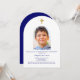 A white background, decorated with a golden cross Personalise and add a photo name and details. Navy blue text. Arch shaped photo frame.