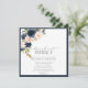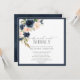 Modern, elegant square Brunch and Bubbly bridal shower invitation featuring a bouquet of navy blue and blush pink flowers, bordered in navy blue. Personalise your bridal shower details in soft off-black, accented with beautiful modern hand lettered calligraphy. The back of the card features a navy blue watercolor texture. Copyright Elegant Invites, all rights reserved.
