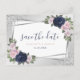 Elegant navy blue, blush and silver wedding save the date postcards featuring silver geometric frames adorned with silver confetti and blue and blush roses. Matching items available.