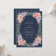 This design features a deep navy blue background that provides a dramatic contrast for soft peach roses and lavender lilac clusters. Verdant evergreen sprigs and pine needles add a seasonal touch to the lush botanical arrangement. The mood is sophisticated and formal, perfect for an evening event. A palette of midnight blue, coral, and muted purple creates a striking aesthetic.