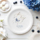 Elegant modern and cute navy blue and gold bow baby shower paper plates, "It's a Boy"