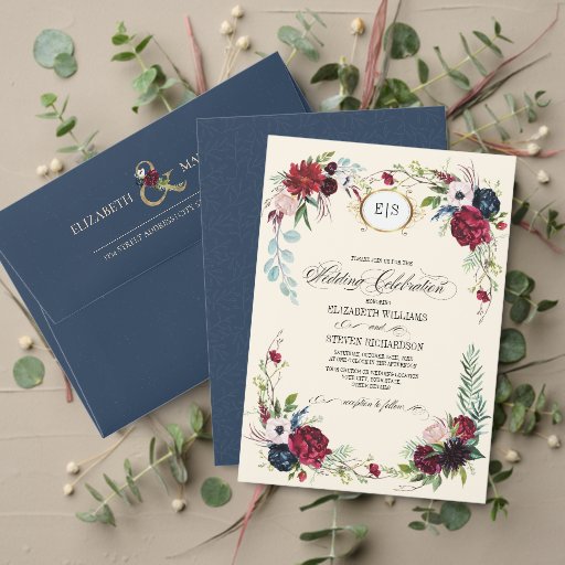 Navy Blue | Burgundy Floral Geometric Wedding Invitation
