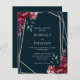 Customisable affordable paper wedding invitation in deep navy blue. Features pretty floral bouquets in deep rich burgundy tones, with a modern gold geometric frame.