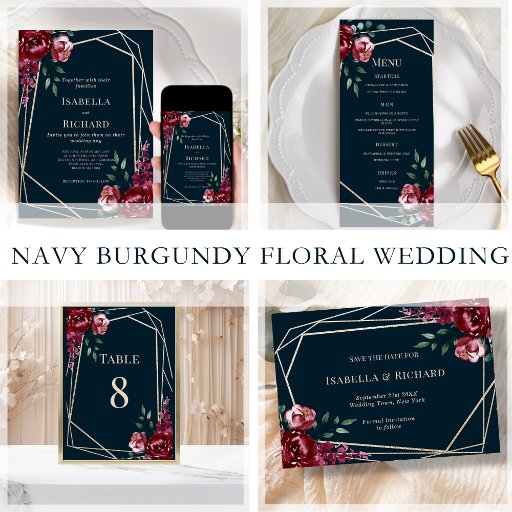 Customisable wedding table number in navy blue. Featuring burgundy, marsala, carmine floral bouquet with a gold geometric frame.