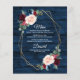 Navy Blue Burgundy Gold Blush Wedding Menu Cards - feature a dark navy blue barn or wood grain background decorated with a printed gold geometric frame that's trimmed with floral and greenery elements in shades of navy, pink, burgundy and more. View the matching collection on this page to find coordinating items.