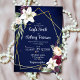 Burgundy roses white lilies sage greenery navy blue background gold geometrical frame floral wedding invitation template with QR RSVP code at the back.