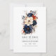 Navy blue, burnt orange, and champagne floral summer wedding save the date card. Ideal for a summer garden wedding.