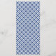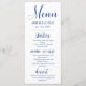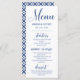 Minimalist wedding menu in white with navy blue calligraphy text and elegant fonts. Personalise with your names and wedding date. The back features a classic tiled pattern in matching colours.