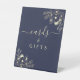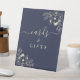Direct your guests with elegance using this navy blue “Cards & Gifts” pedestal sign. Adorned with delicate gold floral accents and modern calligraphy, it’s the perfect touch to guide loved ones at your wedding gift table.