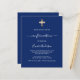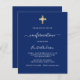 A modern, elegant and invitation. A navy blue background decorated with a golden cross. Personalise and add a name and details. White text.