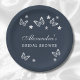 Personalise this whimsically elegant bridal shower paper plate, designed to elevate your celebration with a touch of boho chic charm. Against a sophisticated navy blue background, delicate white butterflies flutter gracefully, adding an air of whimsy and femininity to your festivities. The chic contrast of navy blue and pristine white creates a striking backdrop, while charming white daisy flowers bloom, lending a bohemian flair to your table setting. These paper plates effortlessly blend elegance with a relaxed, boho-inspired vibe, perfect for the modern bride-to-be. Whether you're hosting an intimate gathering or a lavish affair, these plates are sure to enchant your guests with their understated beauty and refined style.