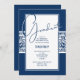 Damask band in navy blue and white bordered in crimson graduation party invitations. SEE ALL COLORS pre-done in our store. **TIP: To change the colours, click on customise further link, enter your colour hex code in the #xxxxxx box to match your school colours.