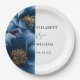 These elegant navy blue and gold floral wedding paper plates can be personalised with your information in modern typography. Designed by Thisisnotme©