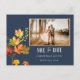Embrace the enchanting beauty of the season with our Elegant Navy Blue Autumn Leaves Photo Save the Date Postcard. This postcard exudes timeless elegance, featuring a stunning photograph of your choice, accentuated by delicate autumn leaves. It's the perfect way to announce your upcoming special day with a touch of seasonal charm. Personalise it with your unique photo and details to create a keepsake that captures the essence of your love story."