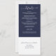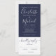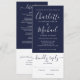 An all in one wedding invitation featuring modern signature script names and elegant typography on a navy blue background. The invitation includes an RSVP card that can be cut off and guest information details. Designed by Thisisnotme©