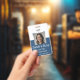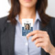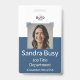 Custom navy Blue vertical badge featuring an employee photo and name, customisable text for employee ID number, role, title, location, or other key details. Add your company logo at the top. The back of the badge includes a custom text field for return information or other important details. This design allows for easy personalisation, ensuring each badge is unique and meets your company's specific needs.